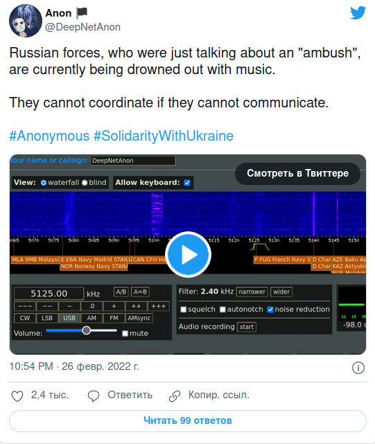 Также хакеры взломали частоту для связи военных России и заглушили ее гимном Украины.