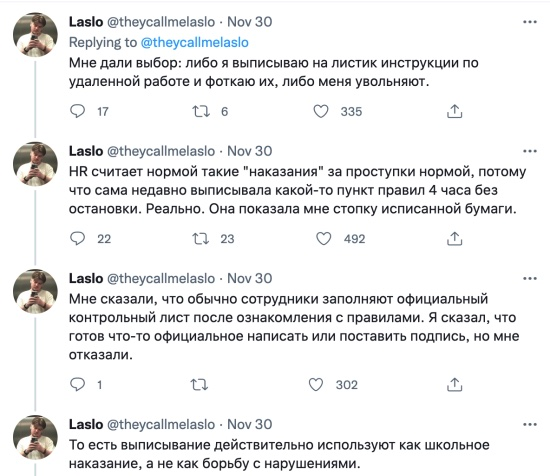 «Мне дали выбор: либо я выписываю на листик инструкции по удаленной работе и фоткаю их, либо меня увольняют. HR считает нормой такие «наказания» за проступки нормой, потому что сама недавно выписывала какой-то пункт правил 4 часа без остановки. Реально. Она показала мне стопку исписанной бумаги. Мне сказали, что обычно сотрудники заполняют официальный контрольный лист после ознакомления с правилами. Я сказал, что готов что-то официальное написать или поставить подпись, но мне отказали. То есть выписывание действительно используют как школьное наказание, а не как борьбу с нарушениями.