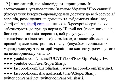 В декабре 2021 был составлен список физических людей и компаний, чьи действия и заявления являются откровенно говоря антиукраинскими. Решили на таких особ наложить санкции в виде блокировки их медиа/интернет ресурсов + FB + YouTube каналов в украинском сегменте интернета. Список этих лиц а также адреса веб ресурсов для блокировки были заблаговременно разосланы всем украинским провайдерам.