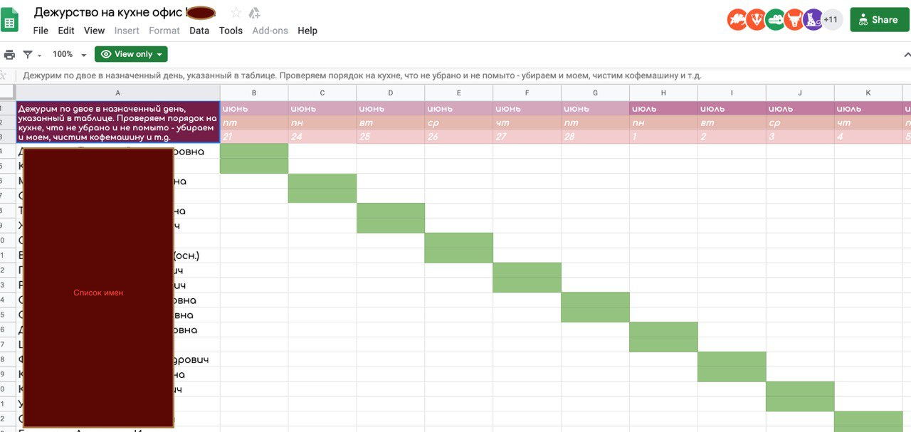 Дежурим по двое в назначенный день, указанный в таблице. Проверяем порядок на кухне, что не убрано и не помыто — убираем и моем, чистим кофемашину и !Imageт.д.