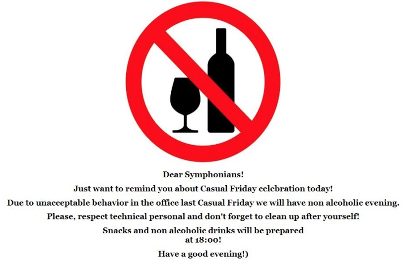 Пишет Анонимус: «В компанії Symphony Solutions є така штука, як casual friday — це кожної п’ятниці в кафе в офісі виставляють безкоштовно пиво, фрукти, горішки і тд. Нещодавно в корпоративних новинах написали, що минулої п’ятниці нехіло подвіжували, тому наступна п’ятниця без алкоголю. Те, що відбулось, в коментарях на скріншоті».
